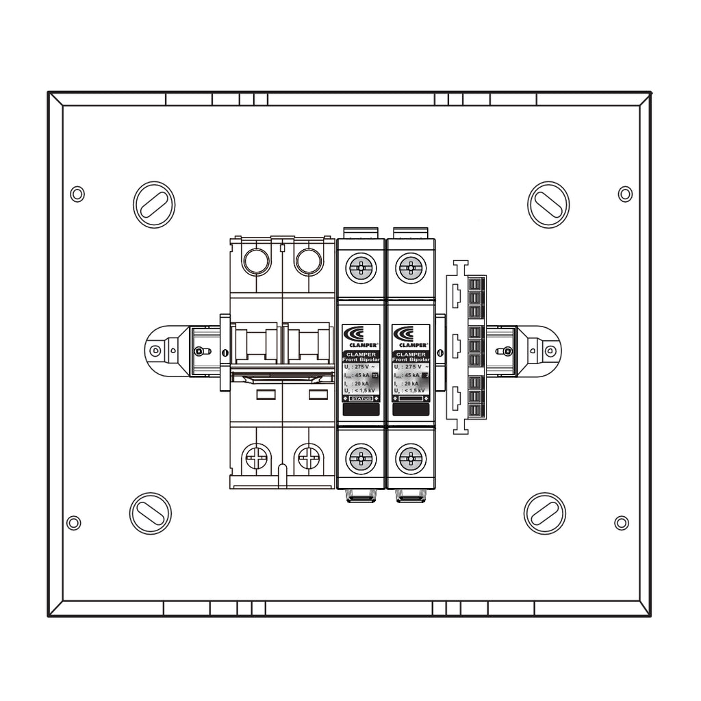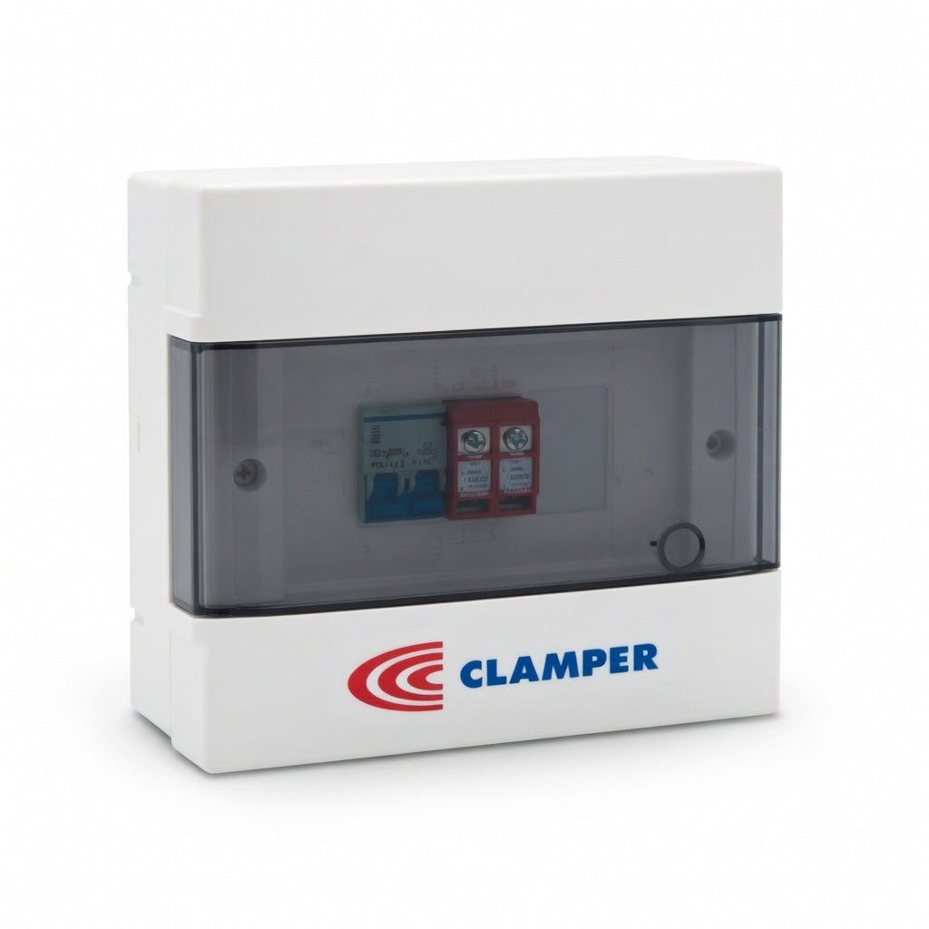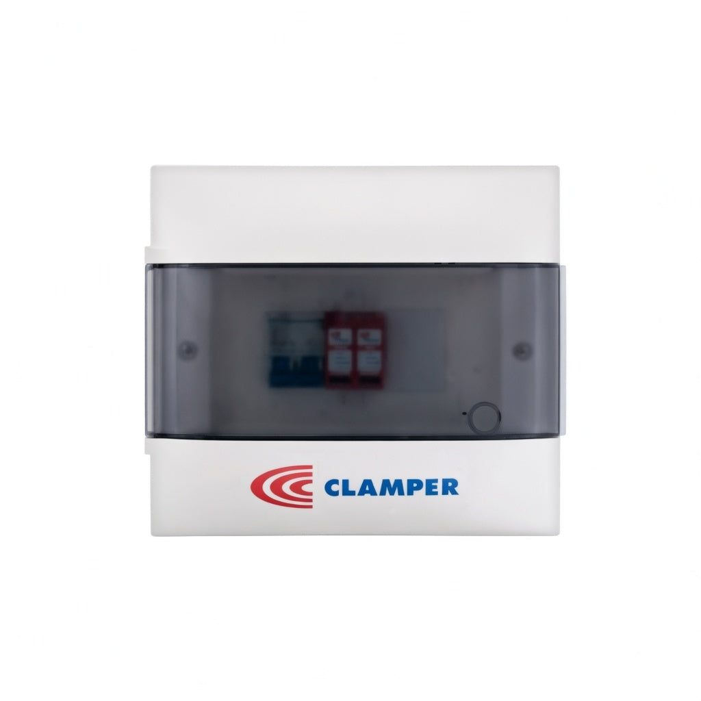 El CLAMPER Front Box 25A 8 es un cuadro de protección de corriente alterna diseñado para garantizar la seguridad y confiabilidad en instalaciones eléctricas. Incorpora dispositivos de protección contra sobretensiones CLAMPER Front y un disyuntor, ofreciendo una solución completa entre el inversor y la red eléctrica.